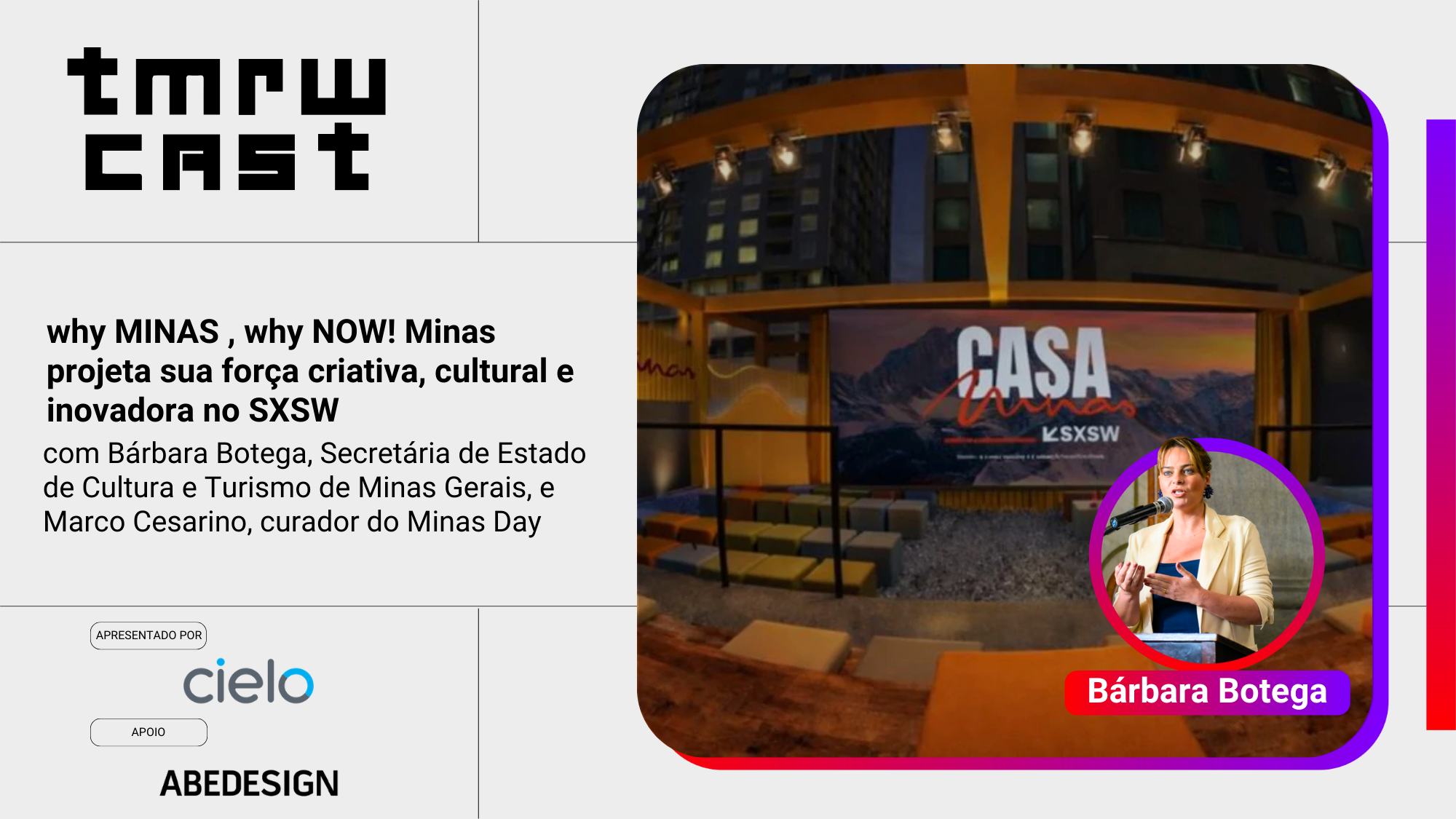 novo episódio do TomorrowCast com Bárbara Bottega, secretária de Estado de Cultura e Turismo de Minas Gerais, e Marco Cesarino, curador do Minas Day, para perceber que há algo mais profundo em curso.